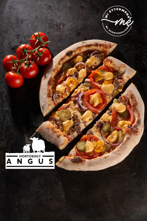 paradicsomos alap, cheddar sajt , csemege uborka, hamburger szósz, lilahagyma, marha húspogácsa, mozzarella , paradicsom