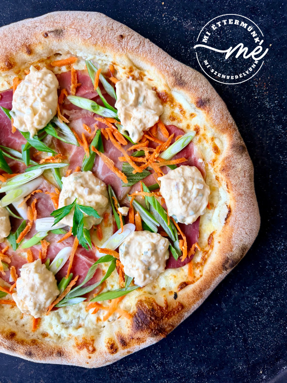 reszelt sárgarépa, friss zöldhagyma, füstölt tarja, majonézes tojáskrém, mozzarella , ricotta krém alap