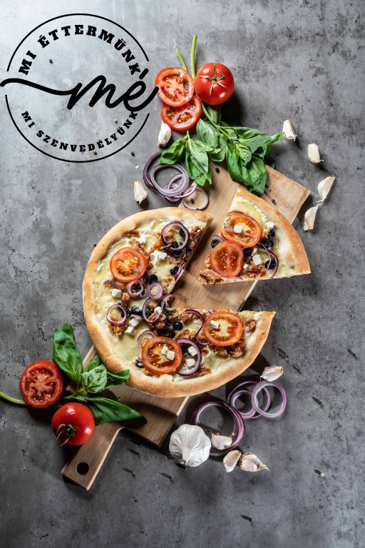 tejfölös alap, feta sajt, gyros hús, lilahagyma, mozzarella , oliva, paradicsom