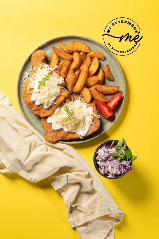 választható köret, amerikai káposztasaláta, fokhagymás tejföl, sajt, sertés karaj
