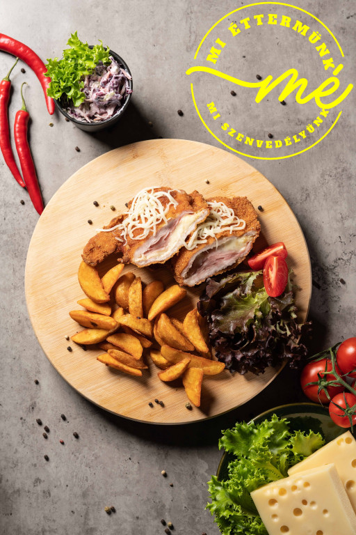 választható köret, amerikai káposztasaláta, sajt, sertés karaj, sonka