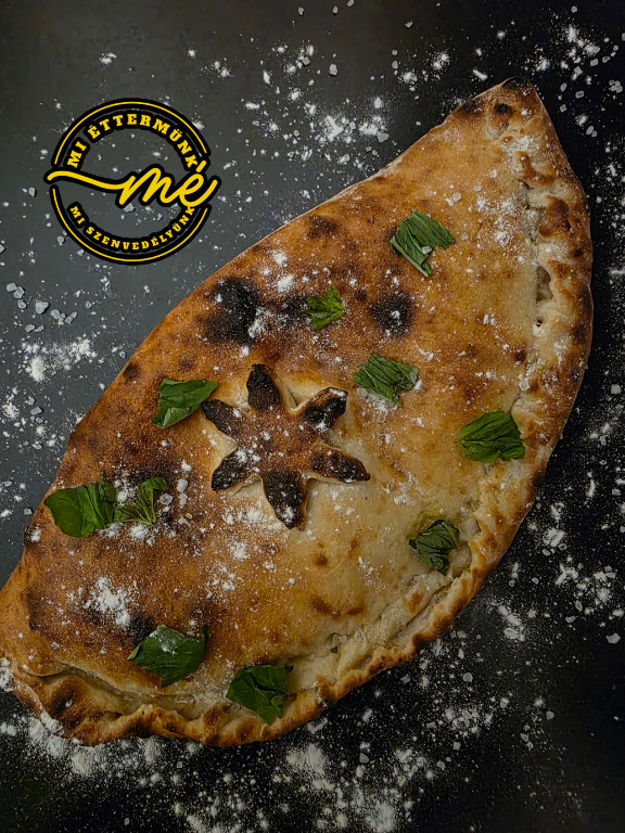 tejfölös alap, alma szeletek, Brie francia lágysajt, fűszeres tépett kacsacomb, lilahagyma, mozzarella