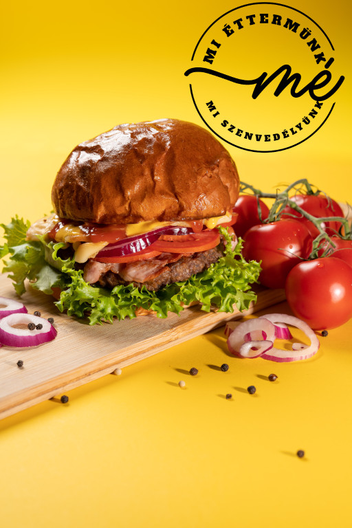 Angus marha húspogácsa, bacon, füstölt grillsajt, hamburger zsemle, ketchup, lilahagyma, házi mustáros mártás, paradicsom, saláta