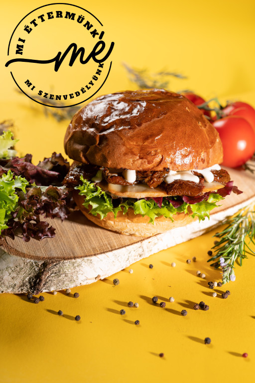 aszalt paradicsom, dupla grillsajt, hamburger zsemle, majonéz, saláta