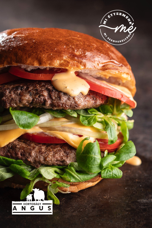 cheddar sajt , dupla angus marha húspogácsa, kapros amerikai szósz, madársaláta, paradicsom, vöröshagyma