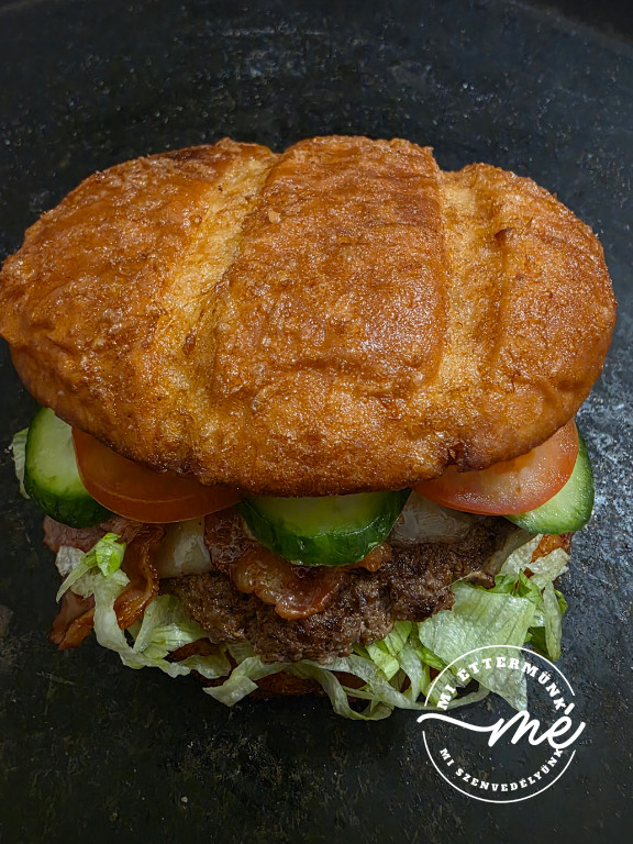 edami sajt, saláta, választható köret, Angus marha húspogácsa, bacon, hagymás hambi szósz, kígyóuborka, paradicsom