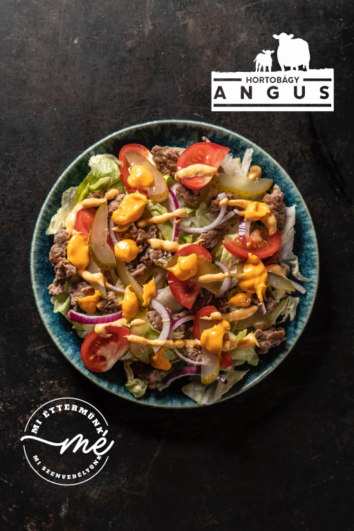 cheddar szósz, csemege uborka, hamburger szósz, jégsaláta, lilahagyma , marha húspogácsa, paradicsom
