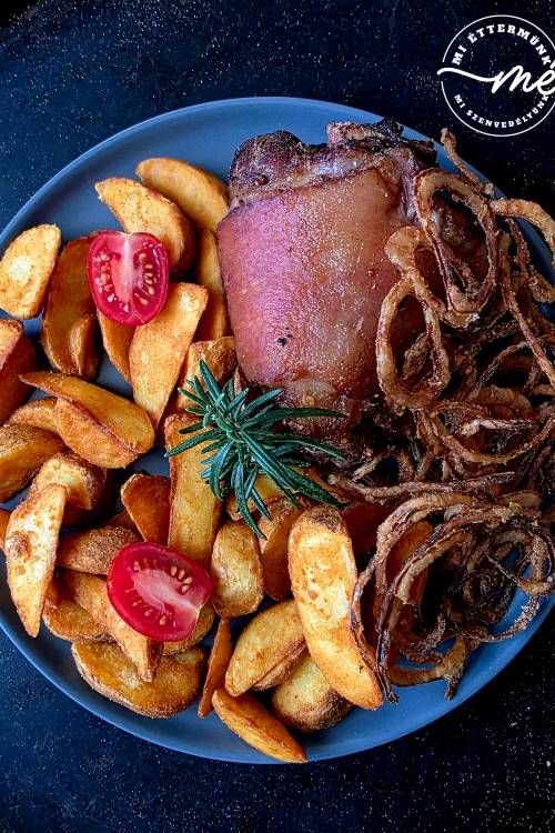 választható köret, füstölt szalonna, fűszerek, sertés karaj, vöröshagyma