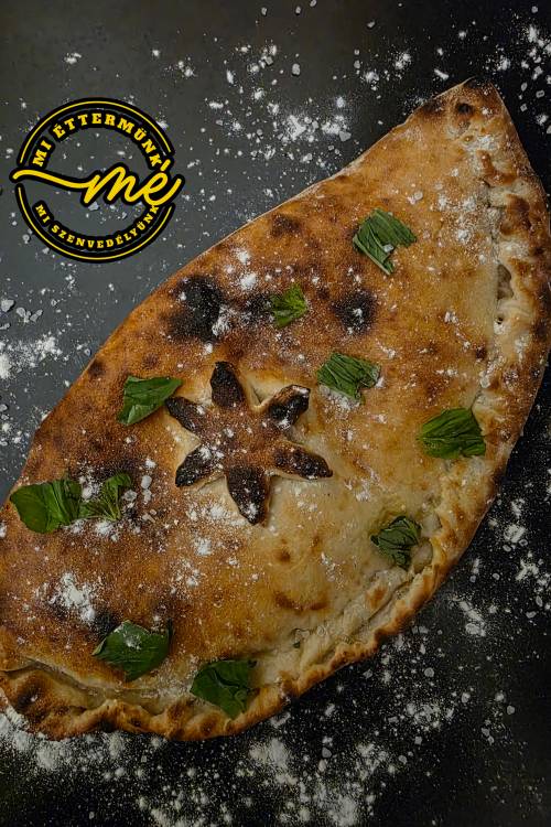 tejfölös alap, alma szeletek, Brie francia lágysajt, fűszeres tépett kacsacomb, lilahagyma, mozzarella